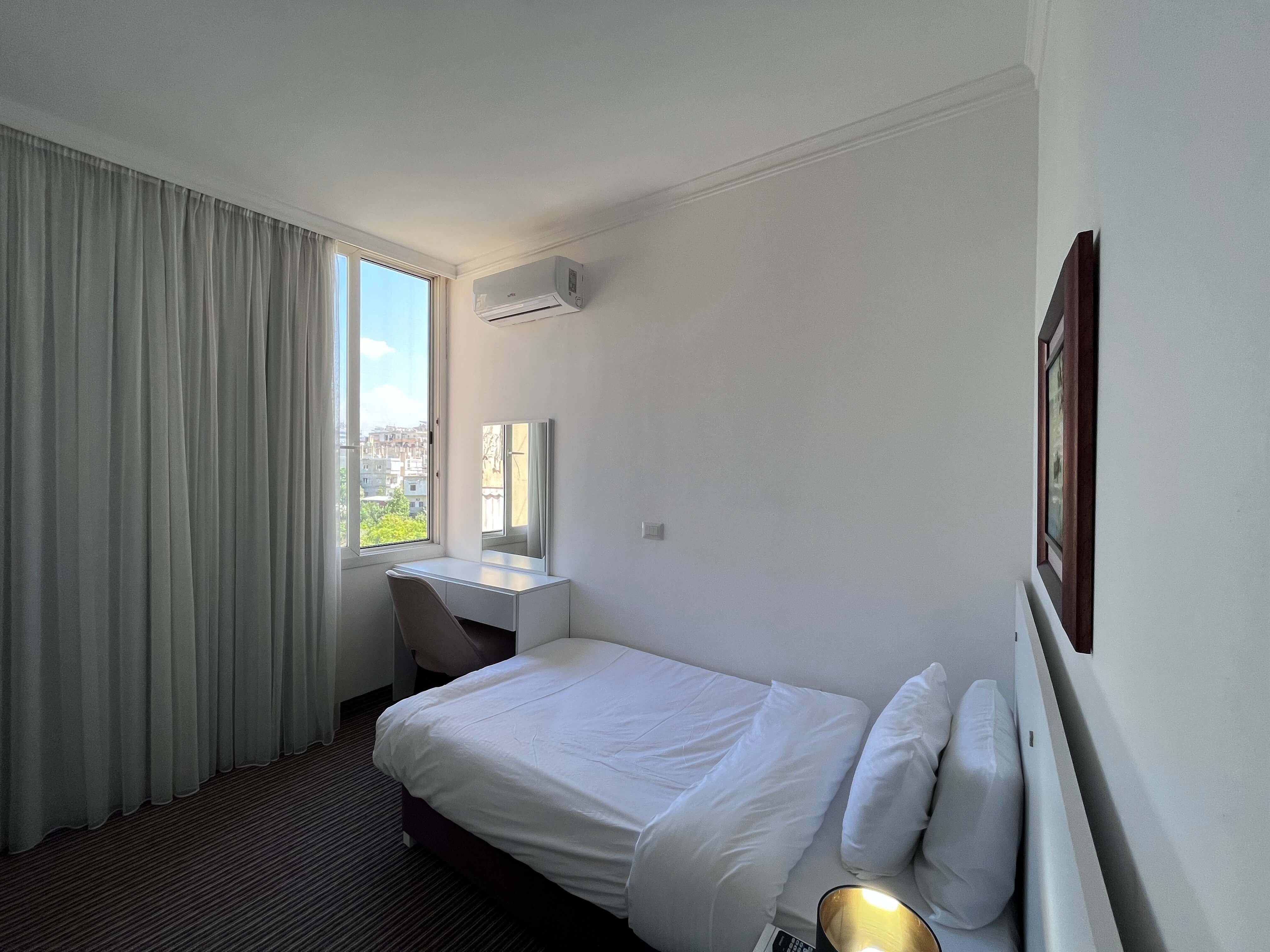 Our Single Rooms are located on the 3rd floor and are 13 sqm in size featuring a private bathroom and one bedroom with a single bed, smart TV, wardrobe and mirrored dressing table.$ 30 per night -